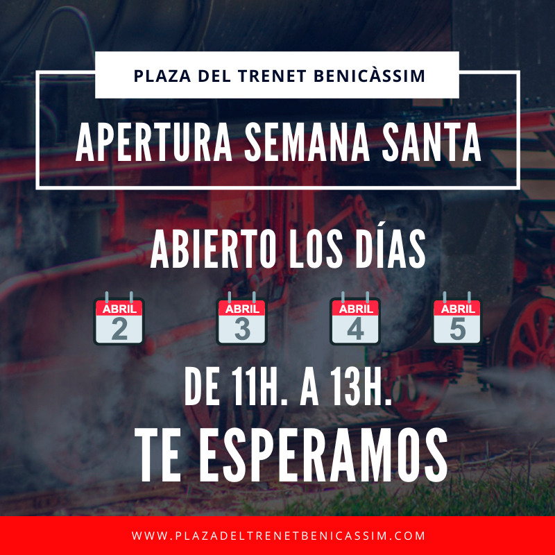 Si estos días de Pascua quieres vivir una aventura en un medio de transporte como son los trenes, pásate por la plaza del trenet Benicàssim.com, podrás subirte y dar un paseo subido a una de nuestras maquinas locomotoras y disfrutar como un autentico enano. Apto para todos los públicos, niños y adultos. La estación estará abierta del viernes al lunes de Pascua de 11h a 13h. Te esperamos.